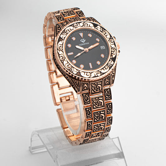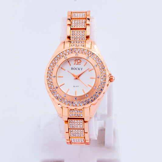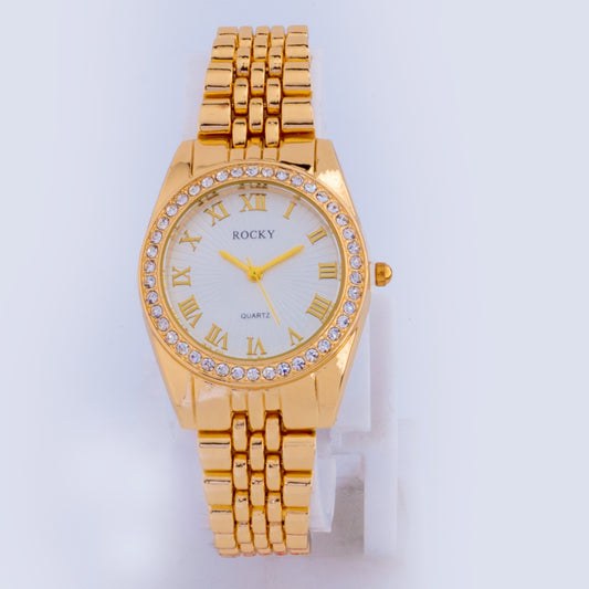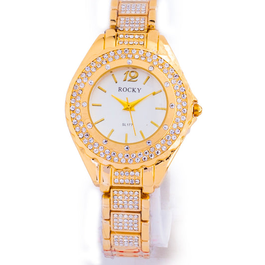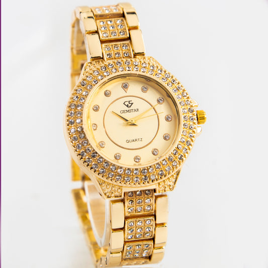 ساعة يد ذهبي مرصعة بالكريستال مع طقم اساور