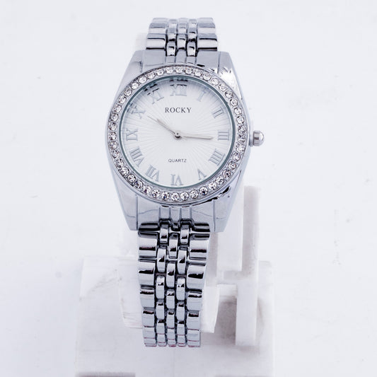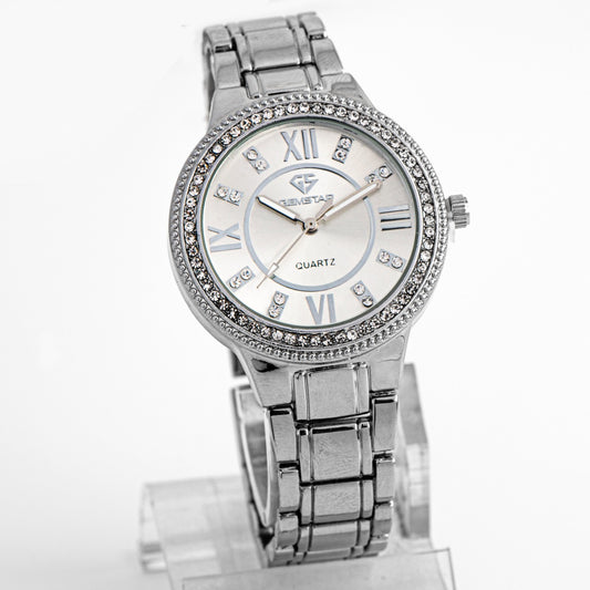 ساعة يد فضية اللون مرصعة بالكريستال مع طقم اساور