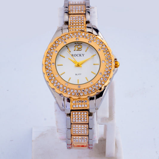 ساعة يد ذهبي و فضي مرصعة بالكريستال مع طقم اساور